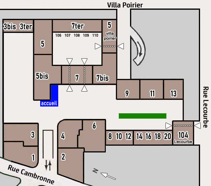 5 Villa Poirier : Situé juste à droite du 7 ter, le bâtiment est accessible par les 2 portes vitrées. Vous pouvez également accéder depuis la rue Villa Poirier (via Google Maps).